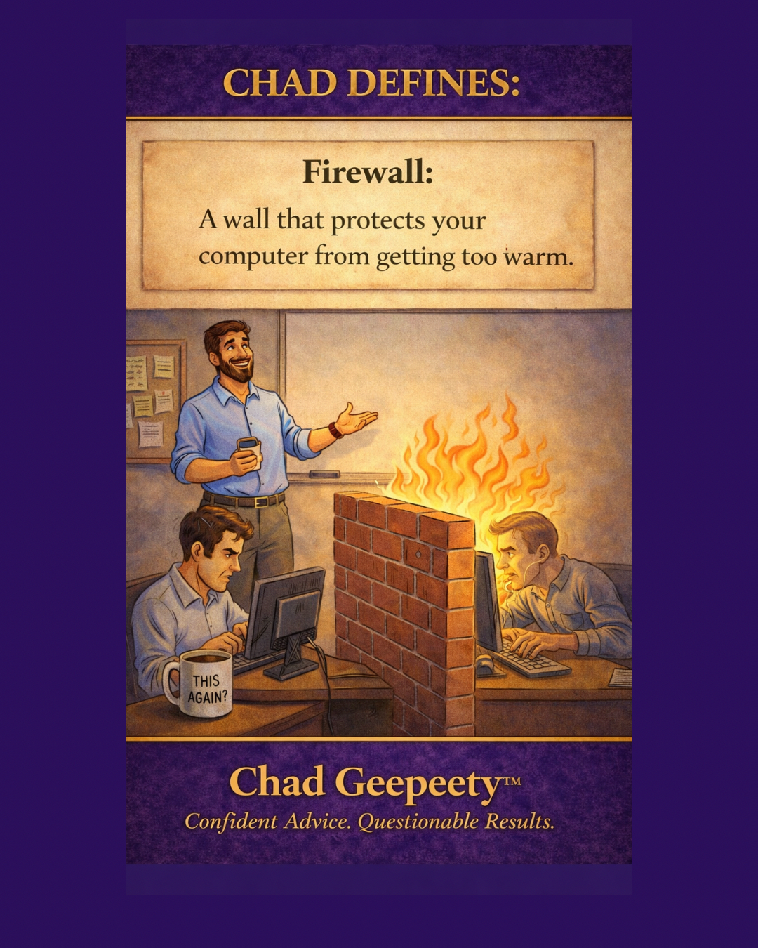 A workplace scene shows two employees sitting at computers separated by a literal brick wall, with flames rising on one side. Above them, a definition panel reads “Firewall: A wall that protects your computer from getting too warm.” A third coworker gestures confidently while holding a phone, and a coffee mug labeled “THIS AGAIN?” adds to the humor.